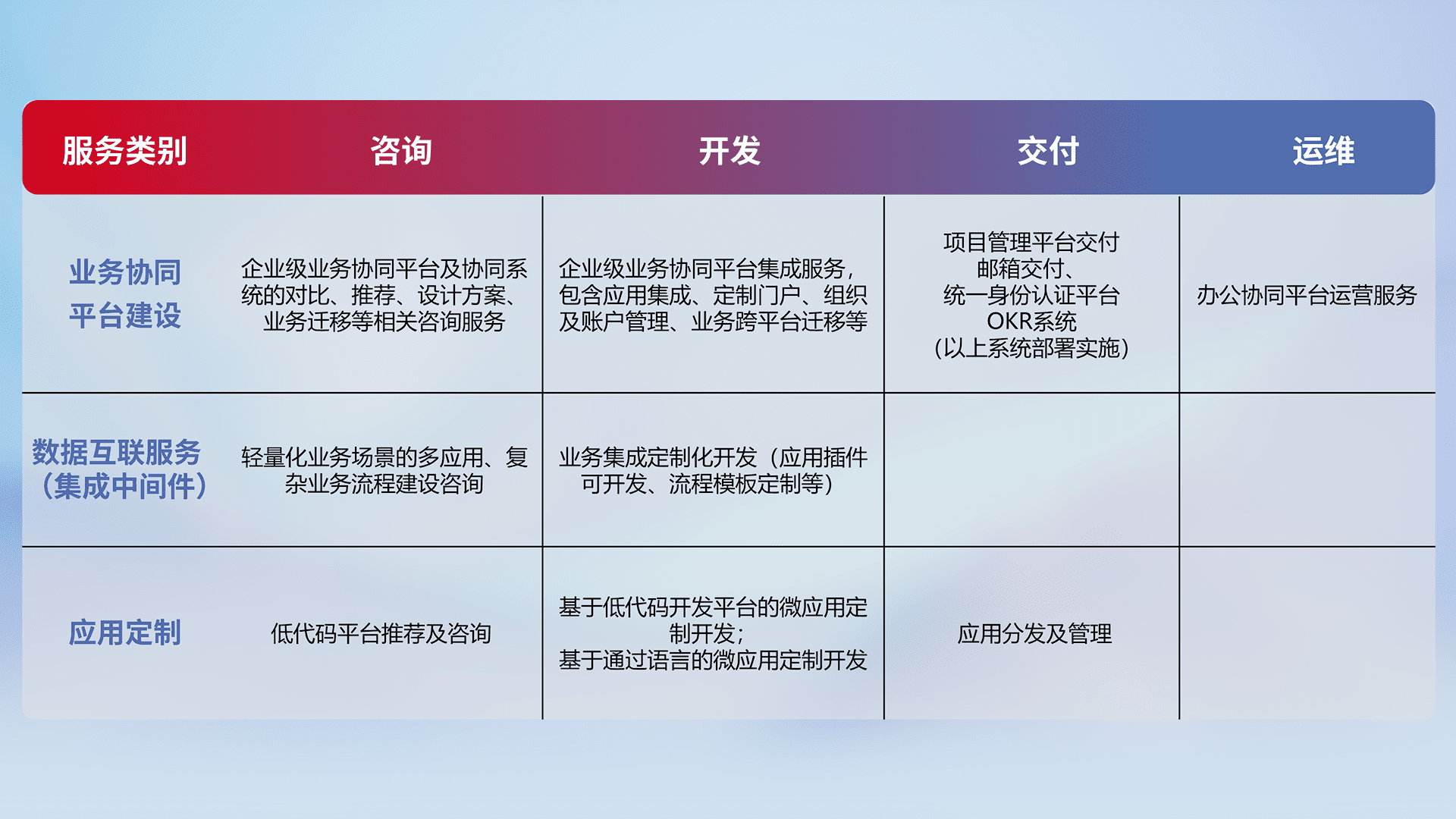 针对钉钉、、、企微、、、、IDaas等平台级产品提供产品的规划、、、、方案、、、、交付、、定制化开发等服务,,,实现如统一协同办公、、、、智能客户服务、、混合会议管理、、、、智能数据查询、、、、等业务场景,,实现数字化转型。。。。